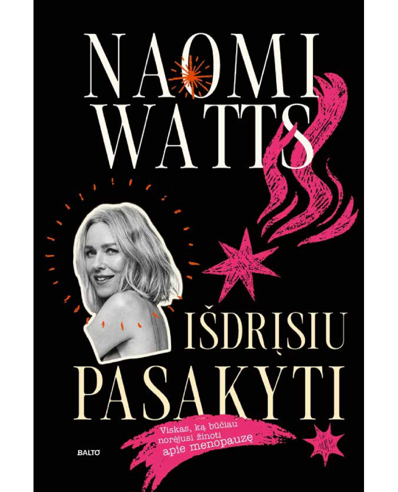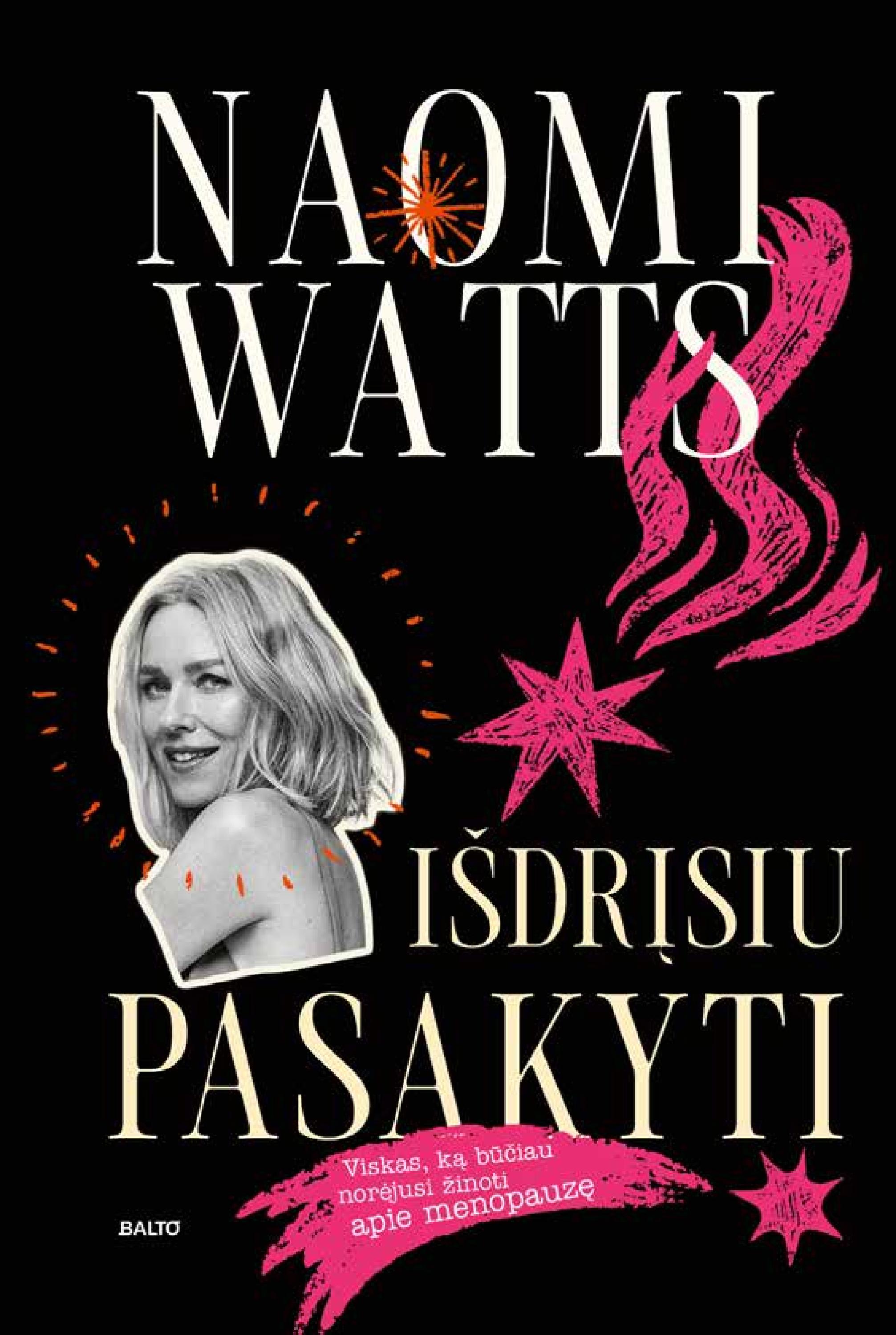 Naomi WattsBūdama vos trisdešimt šešerių Naomi Watts, apsilankiusi pas gydytoją, nes mėgino susilaukti vaikų, išgirdo, kad jai artinasi menopauzė. Ji parašė lengvai skaitomą, bet informatyvią knygą, kokią, pajutusi pirmuosius menopauzės simptomus, mielai būtų perskaičiusi ir pati.