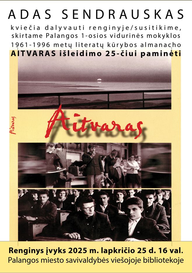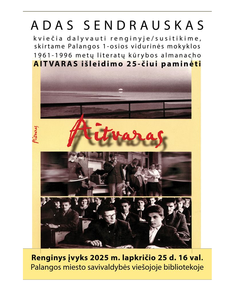 2025-11-25 Renginio data: 2025-11-25 16.00Š. m. lapkričio 25 d. 16 val. Palangos miesto savivaldybės viešojoje bibliotekoje Adas Sendrauskas organizuoja renginį–susitikimą, skirtą Palangos 1-osios vidurinės mokyklos 1961–1996 metų literatų būrelio kūrybos almanacho „Aitvaras“ išleidimo 25-mečiui paminėti.