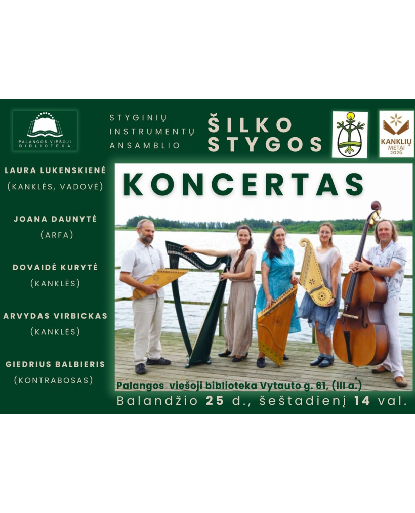 2026-04-25 Renginio data: 2026-04-25 14:00Balandžio 25 d., šeštadienį, 14 val., pačiame Jurginių šventės įkarštyje, kviečiame į Palangos viešosios bibliotekos renginių salę, kur koncertuos styginių instrumentų ansamblis ,,Šilko stygos“. Šis ansamblis – viena ryškiausių grupių Lietuvoje, kuri derina įvairių tradicinių ir šiuolaikinių kanklių skambesius bei juos jungia su akademine arfos elegancija ir žemaisiais styginiais. Tradicinė muzika perteikiama šiuolaikiškai, improvizuotai.
