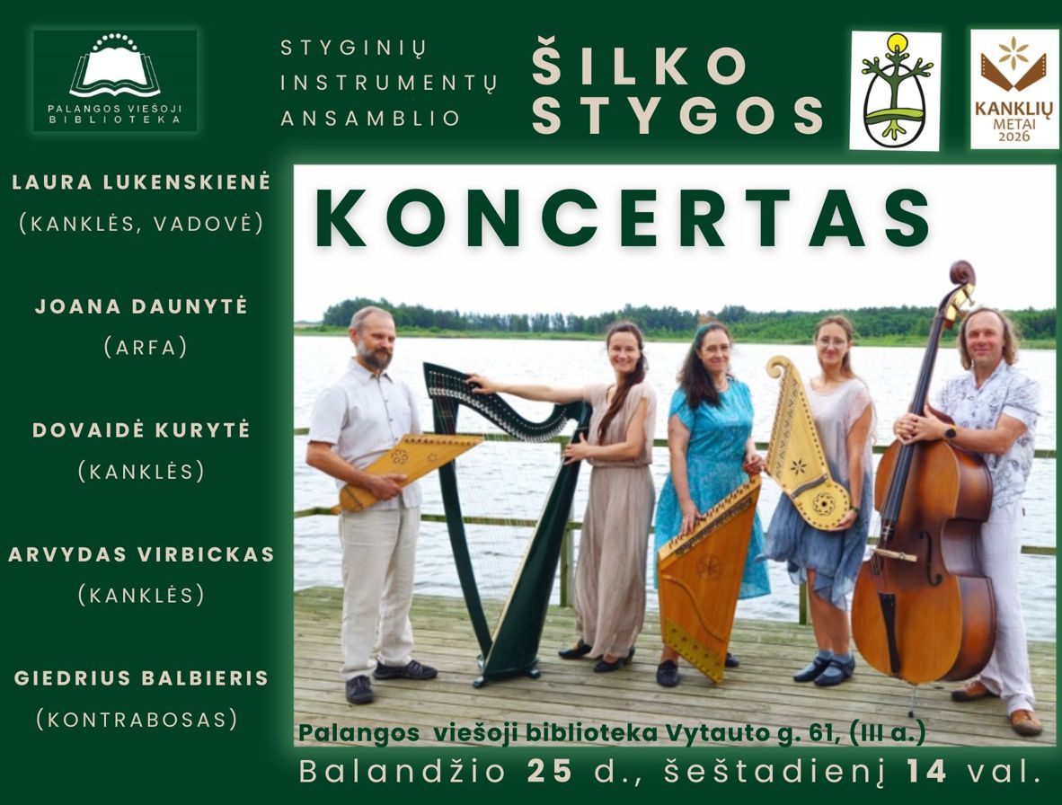 2026-04-25 Renginio data: 2026-04-25 14:00Balandžio 25 d., šeštadienį, 14 val., pačiame Jurginių šventės įkarštyje, kviečiame į Palangos viešosios bibliotekos renginių salę, kur koncertuos styginių instrumentų ansamblis ,,Šilko stygos“. Šis ansamblis – viena ryškiausių grupių Lietuvoje, kuri derina įvairių tradicinių ir šiuolaikinių kanklių skambesius bei juos jungia su akademine arfos elegancija ir žemaisiais styginiais. Tradicinė muzika perteikiama šiuolaikiškai, improvizuotai.