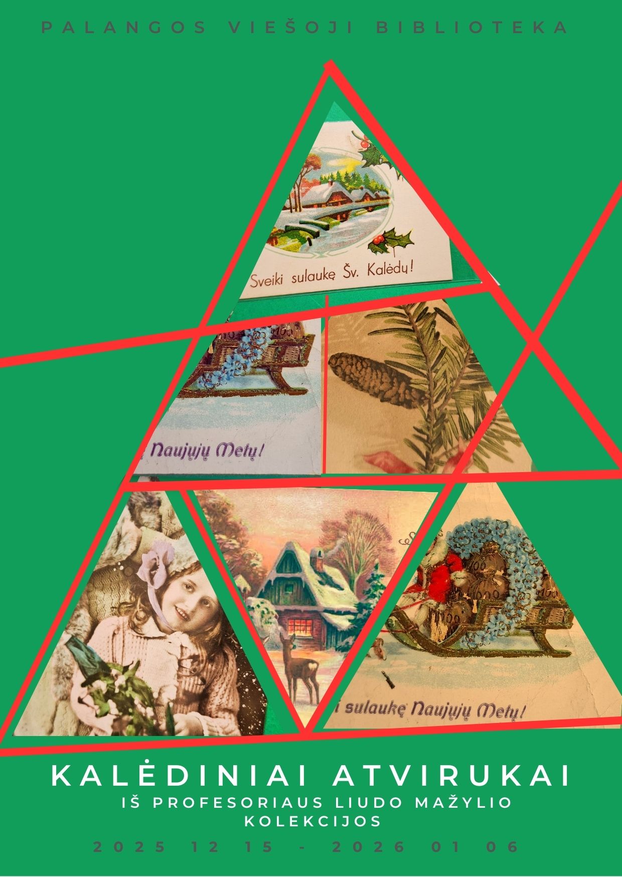 Palangos viešąją biblioteką aplankęs prof. Liudas Mažylis paskolino 30 kruopščiai savo kolekcijoje saugotų tarpukario kalėdinių atvirukų. Parodoje atsispindi to meto švenčių dvasia: 18 atvirukų siųsti iš ar į Lietuvos vietoves, 12 – iš užsienio, daugiausia Vokietijos ir Prancūzijos. Nors dauguma jų turi lietuviškus sveikinimus, tyrimai rodo, kad jie spausdinti ne Lietuvoje.