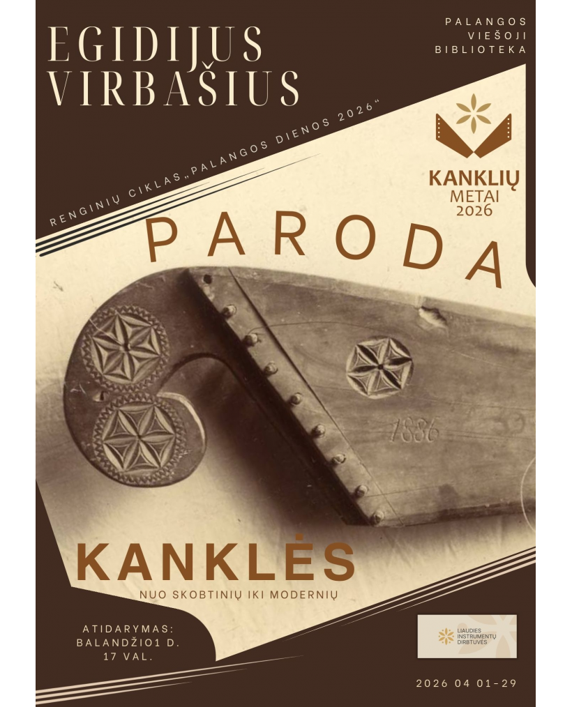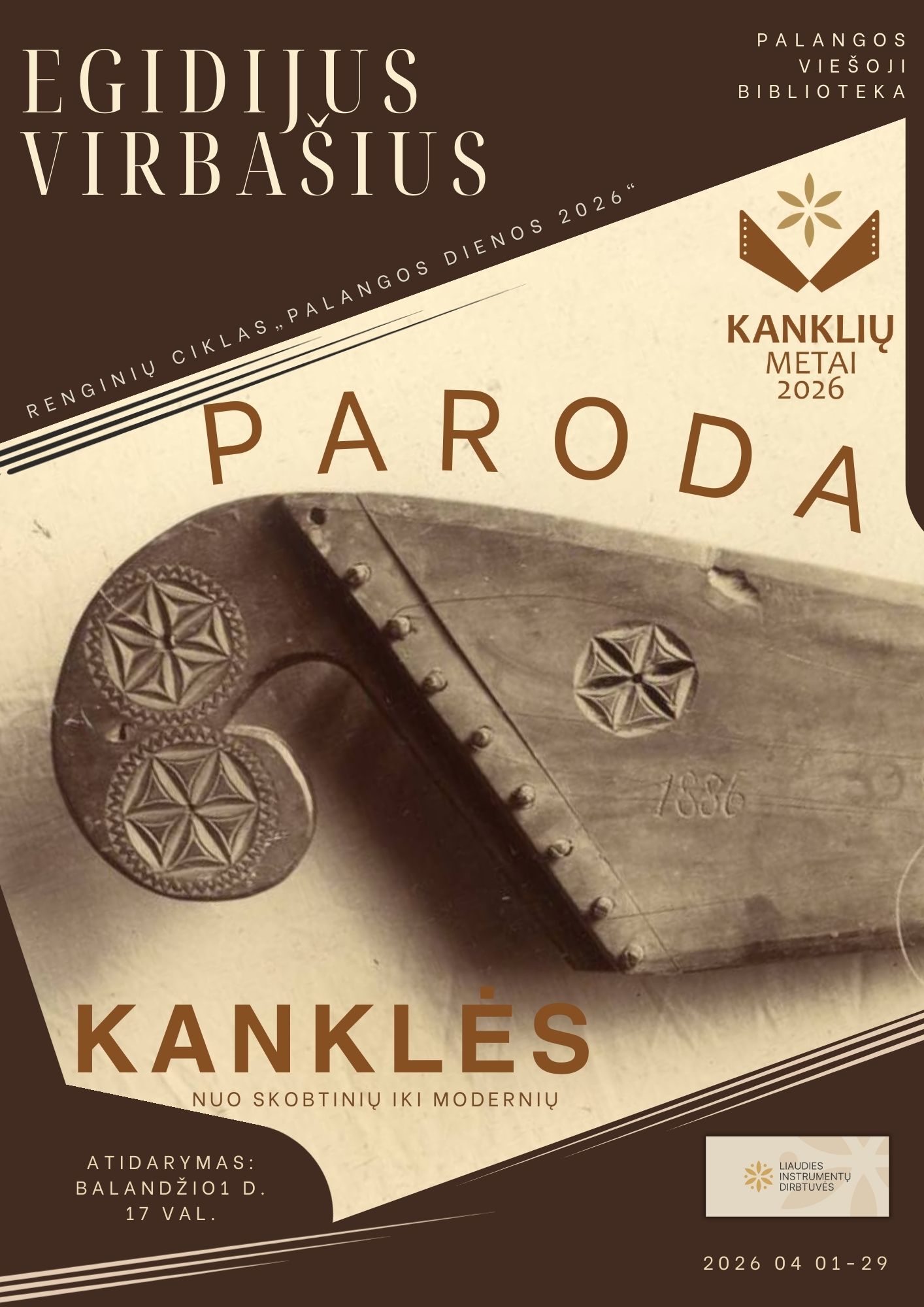 Balandžio 1 d. 17 val. Palangos viešosios bibliotekos parodų salėje ATIDAROMA EGIDIJAUS VIRBAŠIAUS PARODA „KANKLĖS: NUO SKOBTINIŲ IKI MODERNIŲ“, skirta 2026-iesiems – Kanklių metams.