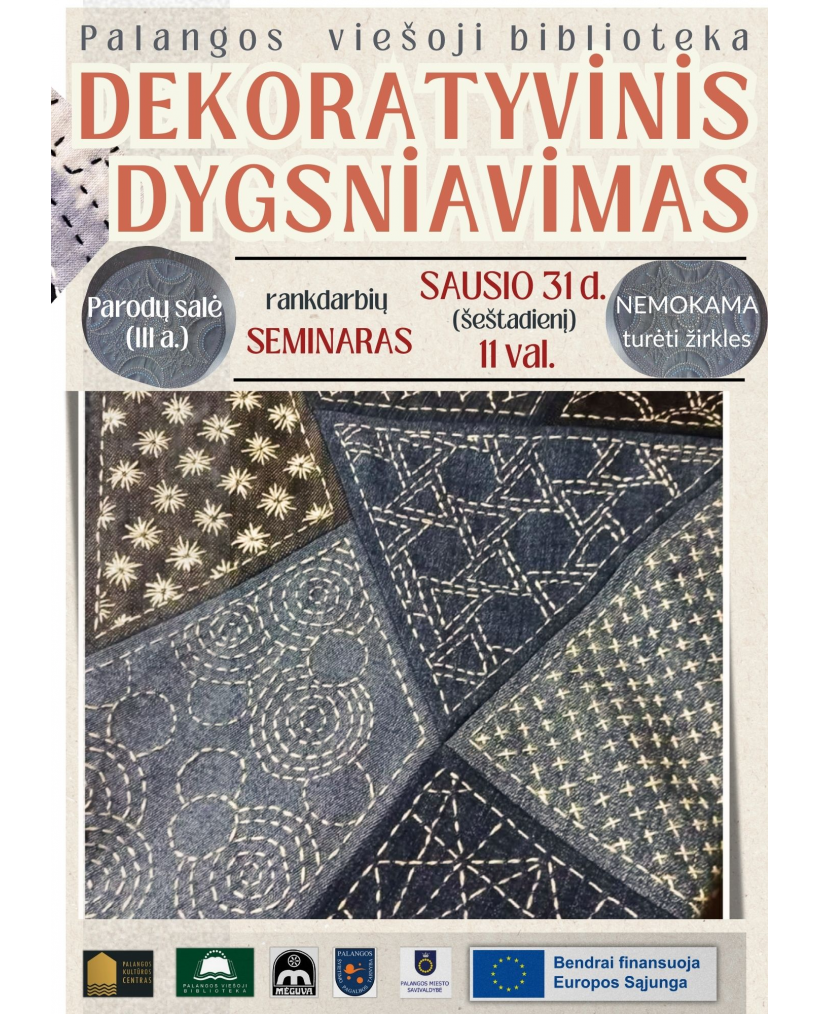 2026-01-21 Renginio data: 2026-01-31 11:00Palangos krašto etnoklubas „Mėguva“ pradeda projekto „Kūrybiška bendrystė Palangoje“ tradicinės tekstilės mokymų ciklą. Į pirmąjį susitikimą išbandyti ir pramokti įvairių dygsniavimo technikų sausio 31 d. (šeštadienį) 11 val. kviečia Palangos rankdarbių meistarnė. Seminaras vyks Palangos viešosios bibliotekos parodų salėje, kur eksponuojama skiautinių klubo „Viskas marga“ paroda „Mėlyna“. Seminaro metu dalyviai turės galimybę susitikti ir pabendrauti su parodos autorėmis.