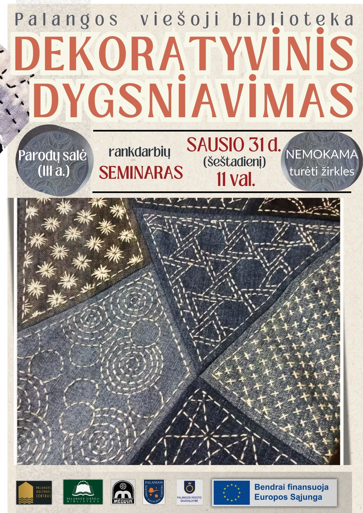 2026-01-21 Renginio data: 2026-01-31 11:00Palangos krašto etnoklubas „Mėguva“ pradeda projekto „Kūrybiška bendrystė Palangoje“ tradicinės tekstilės mokymų ciklą. Į pirmąjį susitikimą išbandyti ir pramokti įvairių dygsniavimo technikų sausio 31 d. (šeštadienį) 11 val. kviečia Palangos rankdarbių meistarnė. Seminaras vyks Palangos viešosios bibliotekos parodų salėje, kur eksponuojama skiautinių klubo „Viskas marga“ paroda „Mėlyna“. Seminaro metu dalyviai turės galimybę susitikti ir pabendrauti su parodos autorėmis.