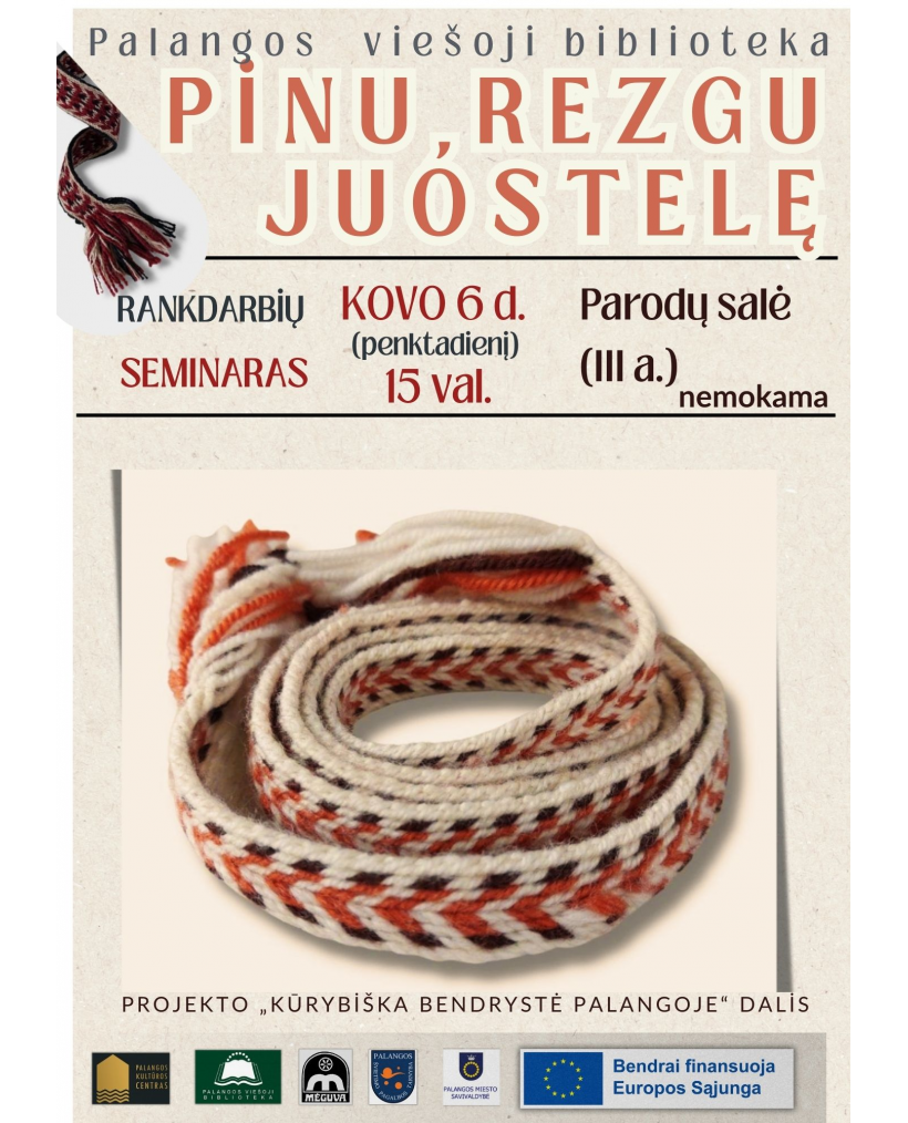 2026-03-06 Renginio data: 2026-03-06 15:00Palangos viešosios bibliotekos parodų salėje kovo 6 d. (penktadienį) 15 val. į rankdarbių seminarą kviečia sertifikuotų tautinio paveldo tradicinių amatų meistrė, vytinių ir pintinių juostų audimo amatų puoselėtoja Loreta Steponavičienė. Tai projekto „Kūrybiška bendrystė Palangoje“ tradicinės tekstilės mokymų ciklo dalis. Praktinio užsiėmimo metu ne tik nusipinsite juostelę, bet ir susipažinsite su Aukštaitijai būdinga išskirtinai senos kilmės pintinių juostų tradicija bei jos praktiniu pritaikymų šiandien.