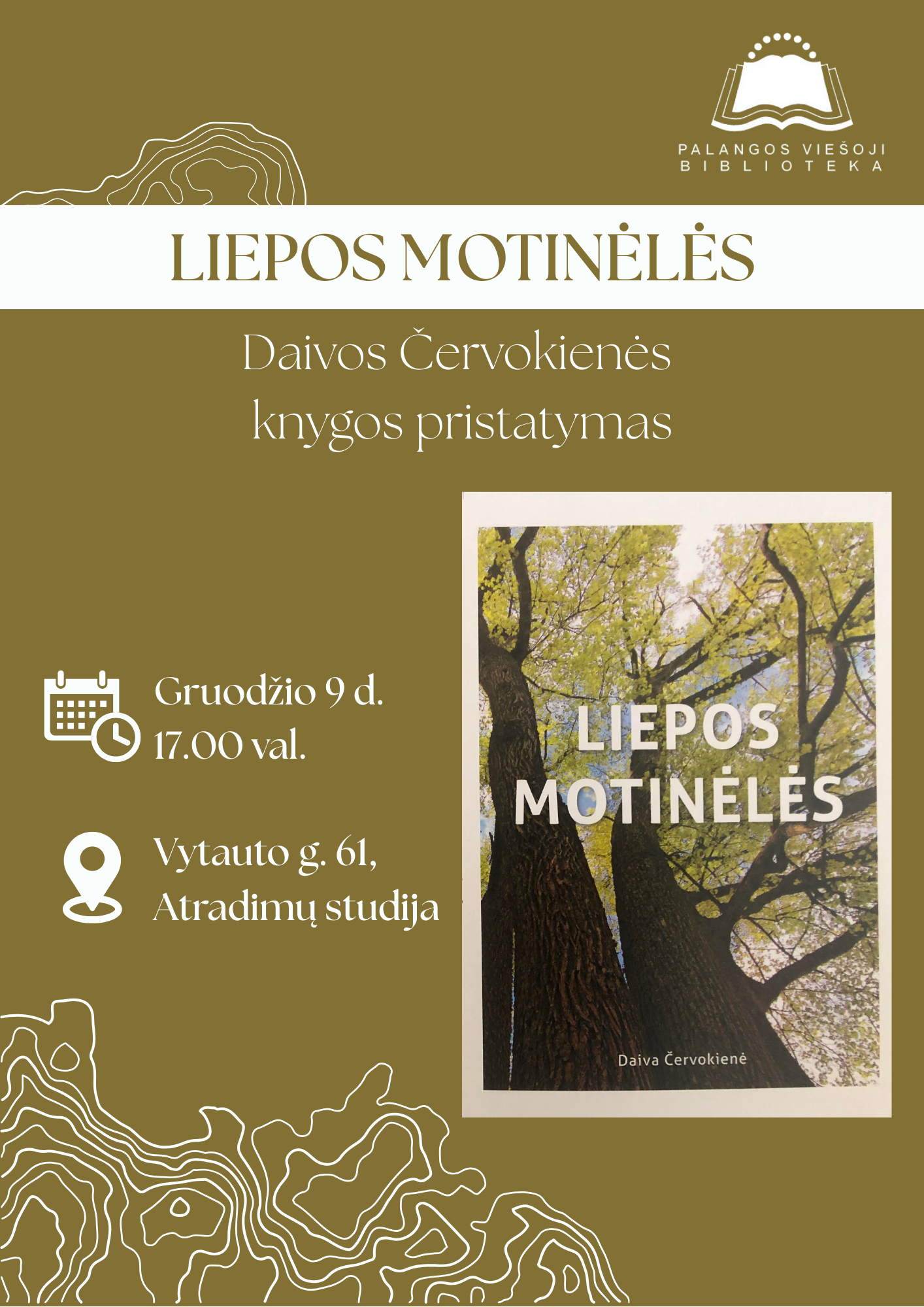 2025-12-09 Renginio data: 2025-12-09 17.00Kviečiame į susitikimą su žurnaliste, gamtos pažinimo puoselėtoja ir knygos „Liepos motinėlės“ autore Daiva Červokiene. Renginyje dalyvaus ir „Žolinčių akademijos“ vadovė Danutė Kunčienė.