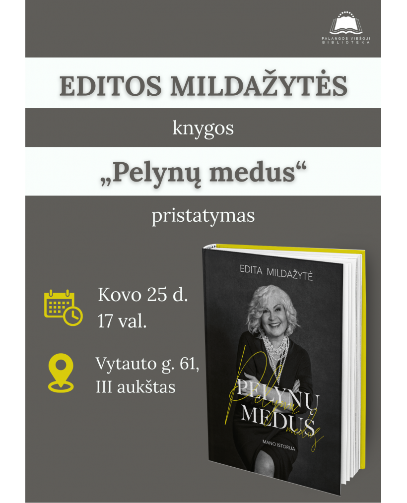 2026-03-25 Renginio data: 2026-03-25 17.00Kovo 25 d. 17 val. Palangos viešosios bibliotekos renginių salėje (III a.) vyks susitikimas su žurnaliste, televizijos laidų kūrėja ir visuomenės veikėja Edita Mildažyte. Renginio metu bus pristatyta jos autobiografinė knyga „Pelynų medus. Mano istorija“.