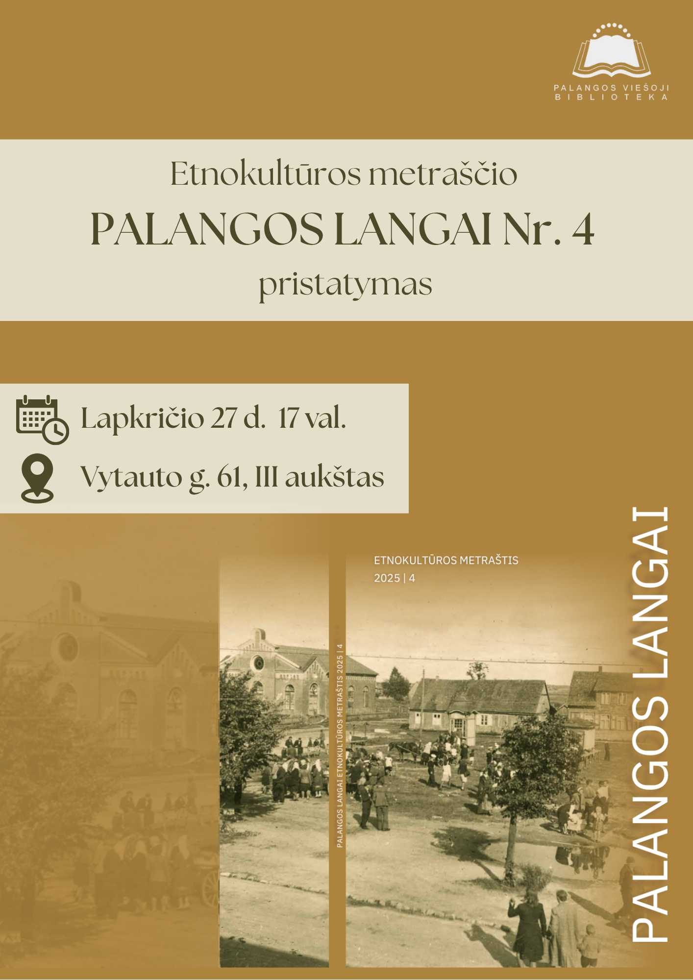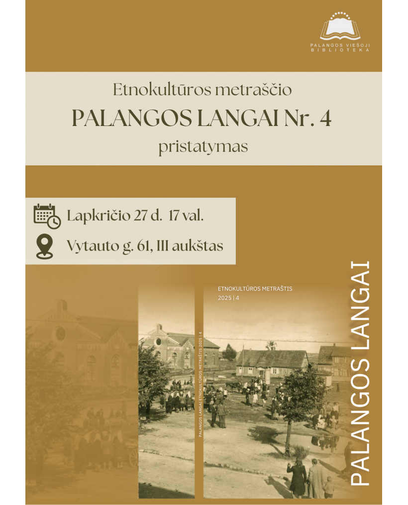 2025-11-27 Renginio data: 2025-11-27 17.00Kviečiame į ketvirtojo etnokultūros metraščio „Palangos langai“ pristatymą, kuris vyks lapkričio 27 d. 17 val. Palangos viešojoje bibliotekoje. Renginyje dalyvaus leidinio sudarytojai ir tekstų autoriai.