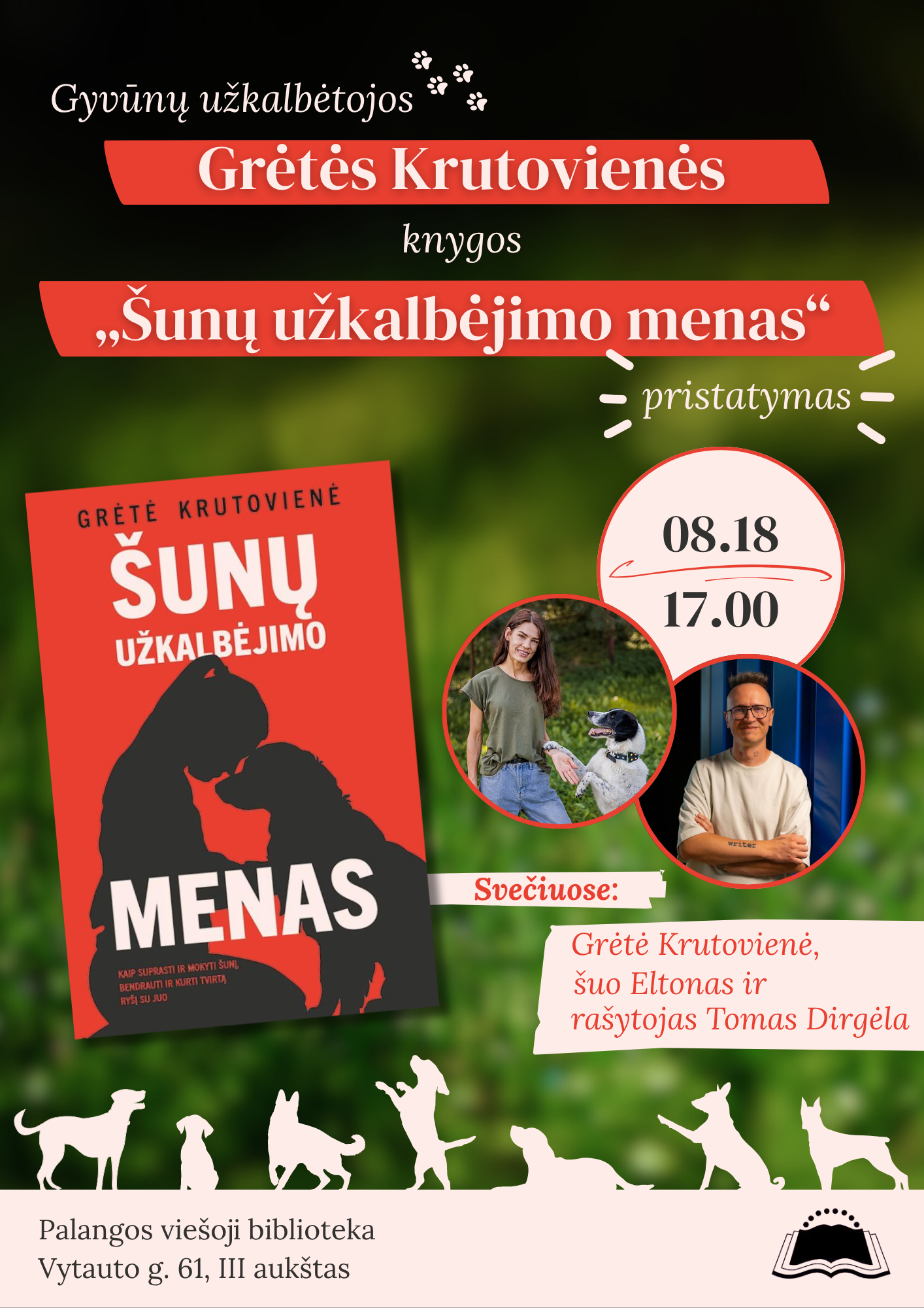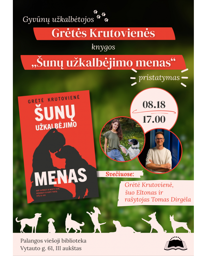 2025 - 08 - 05 Renginio data: 2025 - 08 - 18 17:00Rugpjūčio 18 d. 17 val. Palangos viešosios bibliotekos renginių salėje (III a.) vyks Grėtės Krutovienės knygos „Šunų užkalbėjimo menas. Kaip suprasti ir mokyti šunį, bendrauti ir kurti tvirtą ryšį su juo“ pristatymas.
