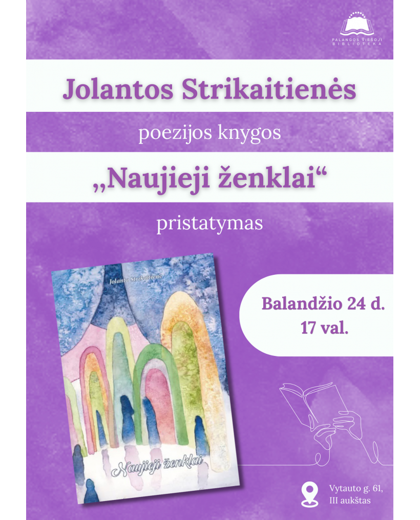 2026-04-24 Renginio data: 2026-04-24 17.00Balandžio 24 d. 17 val. Palangos viešosios bibliotekos renginių salėje vyks jaukus literatūrinis susitikimas – autorė Jolanta Strikaitienė pristatys savo šeštąją poezijos knygą „Naujieji ženklai“.