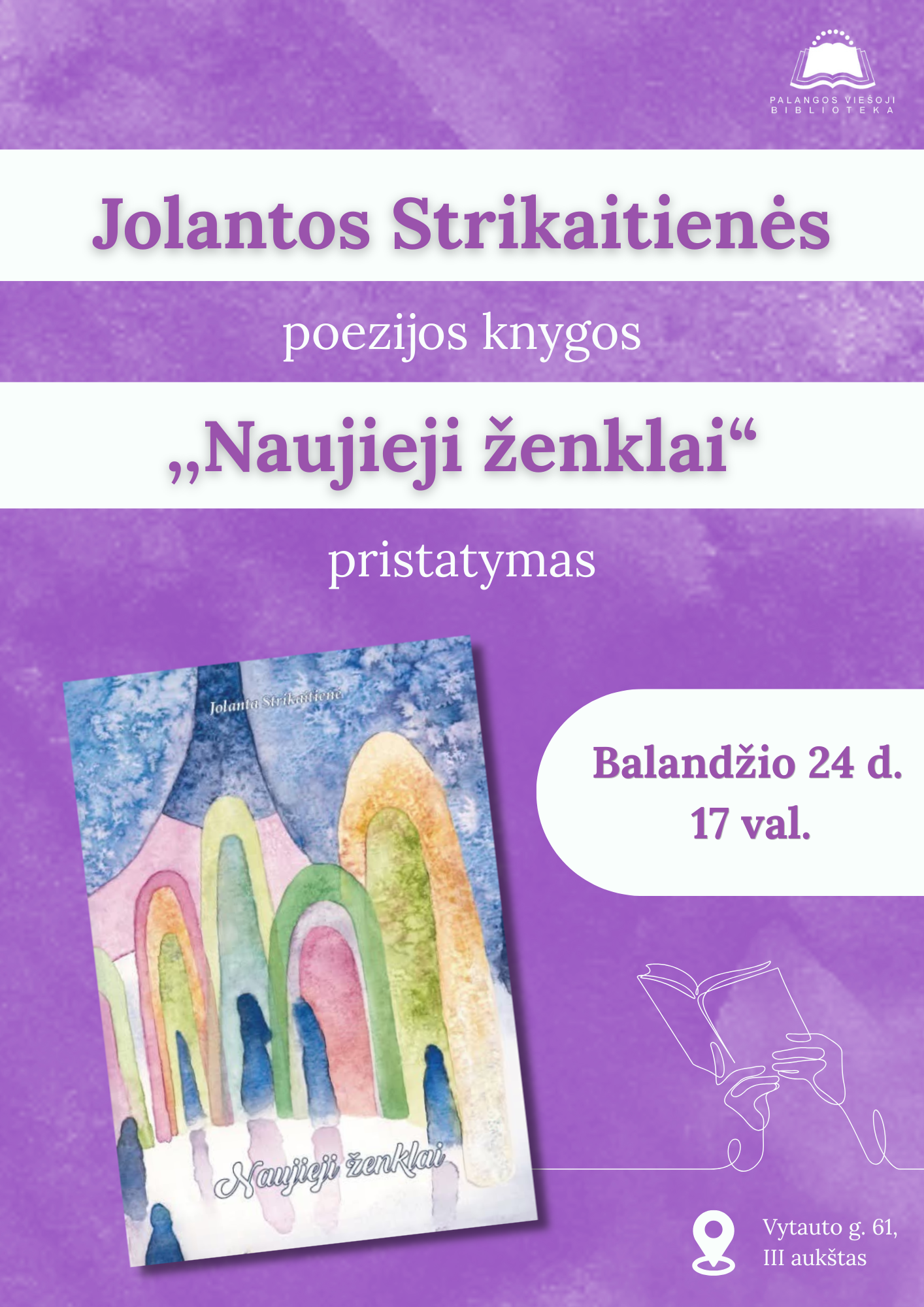 2026-04-24 Renginio data: 2026-04-24 17.00Balandžio 24 d. 17 val. Palangos viešosios bibliotekos renginių salėje vyks jaukus literatūrinis susitikimas – autorė Jolanta Strikaitienė pristatys savo šeštąją poezijos knygą „Naujieji ženklai“.