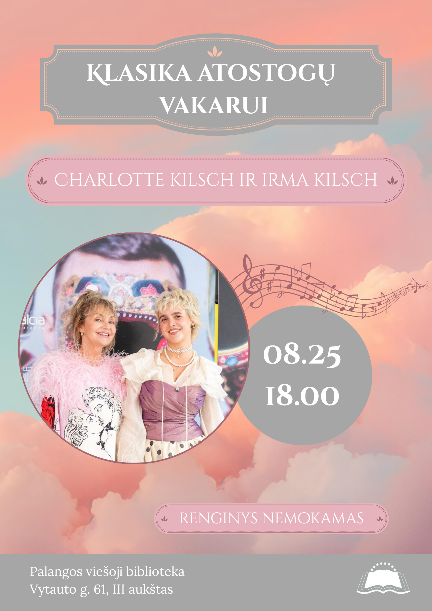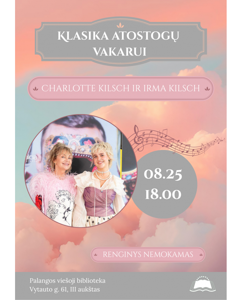 2025 - 08 - 08 Renginio data: 2025 - 08 - 25 18:00Šią vasarą klausytojus vėl džiugins jausmingas mamos ir dukros duetas! Rugpjūčio 25 d. 18 val. kviečiame į klasikinės muzikos koncertą, kurį dovanoja Charlotte Kilsch ir Irma Kilsch. Koncertas vyks Palangos viešosios bibliotekos renginių salėje (IIIa.). Renginys nemokamas.