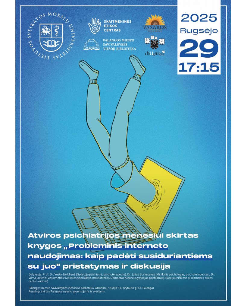 Renginio metu bus pristatoma knyga „Probleminis interneto naudojimas: kaip padėti susiduriantiems su juo” ir vyks diskusija, kurioje dalyvaus LSMU Neuromokslų instituto Palangos klinikos gydytojai psichiatrai ir Elgesio medicinos laboratorijos mokslininkai bei Skaitmeninės etikos centro atstovai: profesorė Dr. Vesta Steiblienė (psichiatrė, psichoterapeutė), Dr. Julius Burkauskas (klinikinis psichologas, psichoterapeutas), Dr. Vilma Jakienė (visuomenės Sveikatos specialistė, mokslininkė), Domantas Alekna (psichiatras), Rasa Jauniškienė (Skaitmeninės etikos centro vadovė).