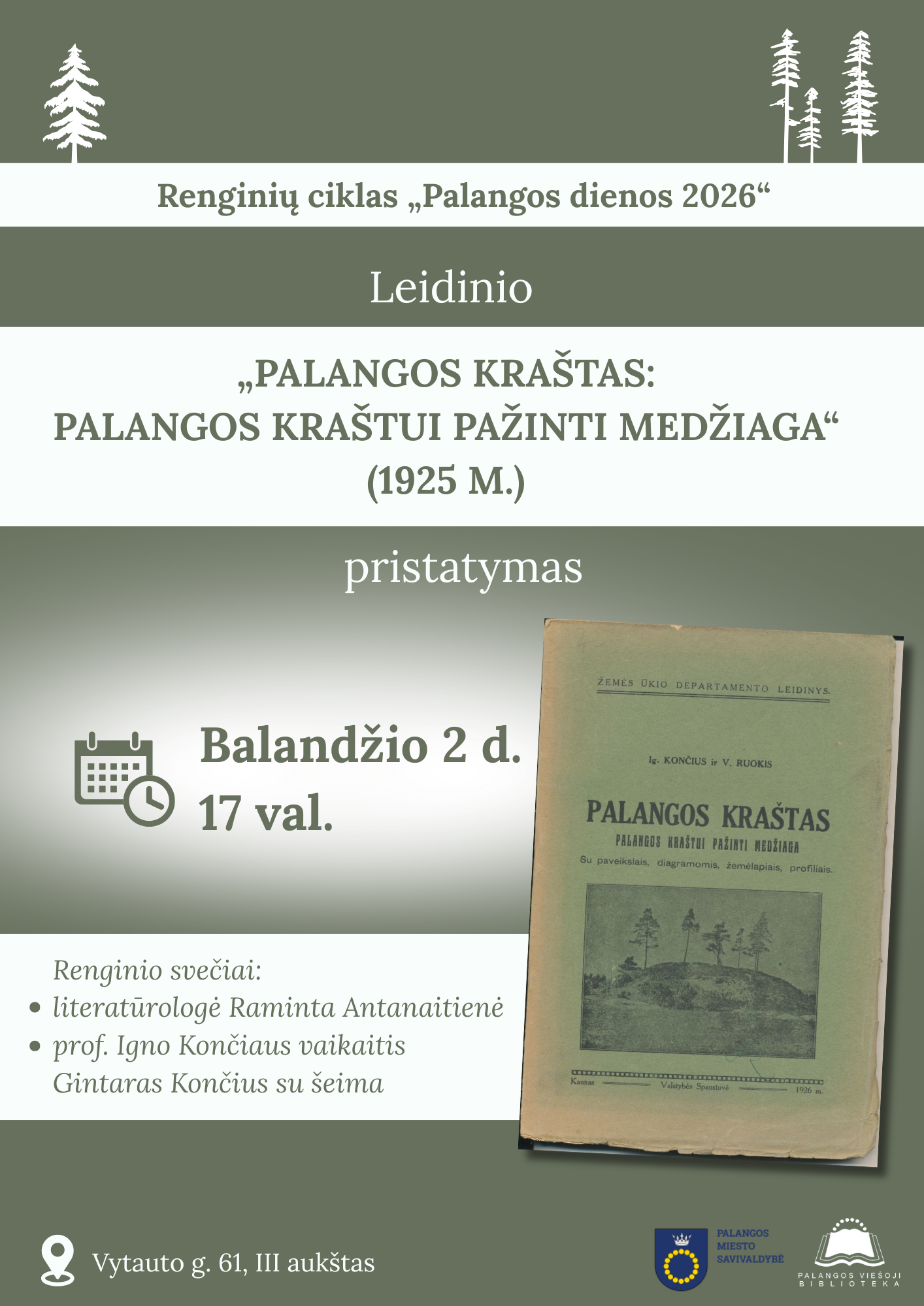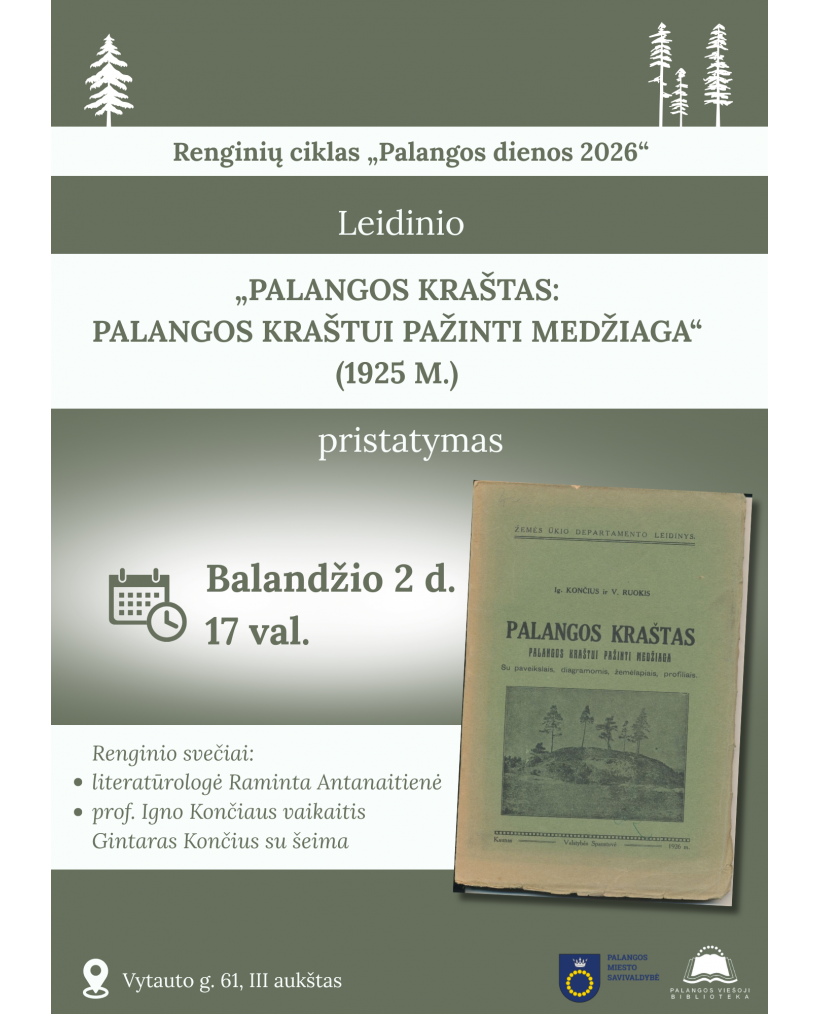 2026-04-02 Renginio data: 2026-04-02 17.00Balandžio 2 d. 17 val. Palangos miesto savivaldybės viešosios bibliotekos renginių salėje (III a.) vyks perleisto leidinio „Palangos kraštas: Palangos kraštui pažinti medžiaga“ (1925 m.) pristatymas. Šis renginys yra renginių ciklo „Palangos dienos 2026“ dalis.