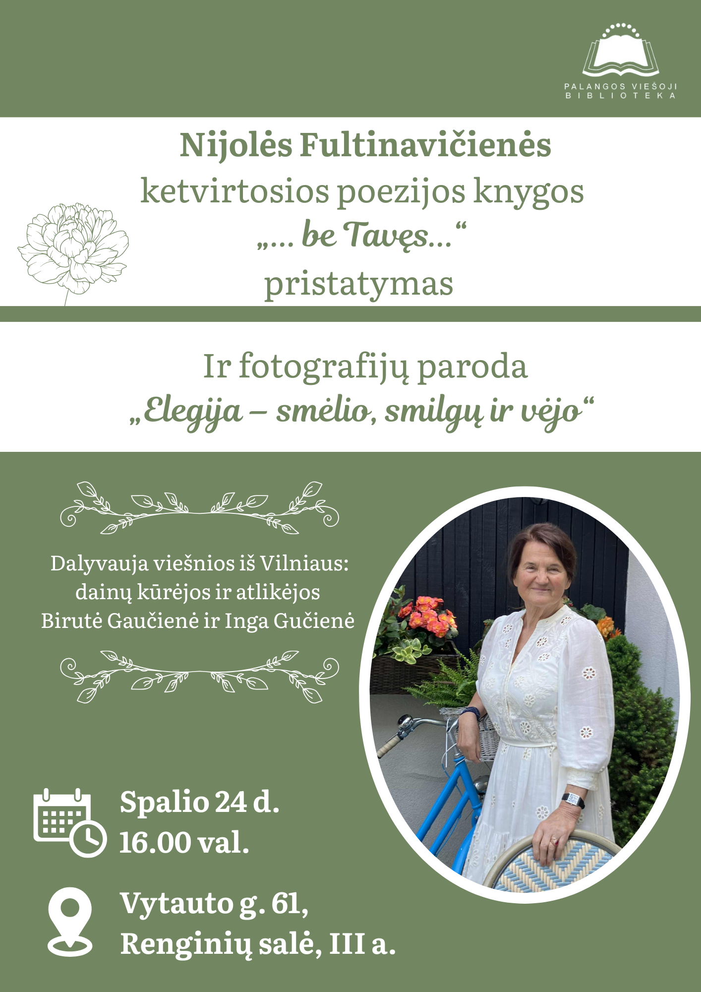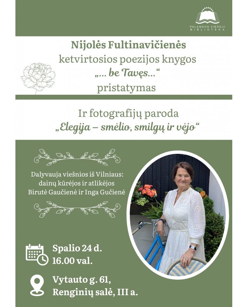 2025-10-14 Renginio data: 2025-10-24 16.00Spalio 24 d. 16 val. kviečiame į Nijolės Fultinavičienės ketvirtosios poezijos knygos „... be Tavęs...“ pristatymą ir meninių fotografijų parodą „Elegija – smėlio, smilgų ir vėjo“.