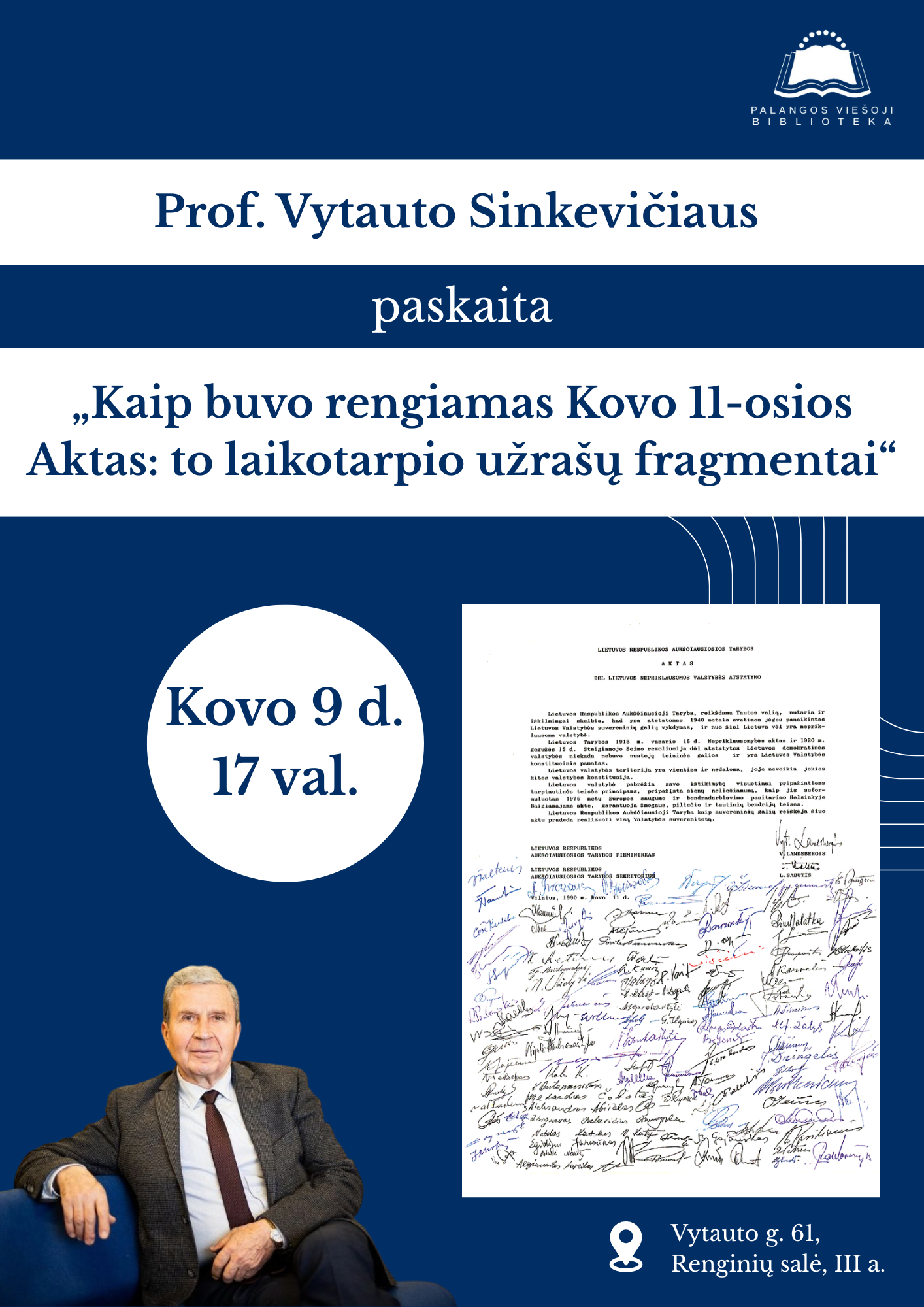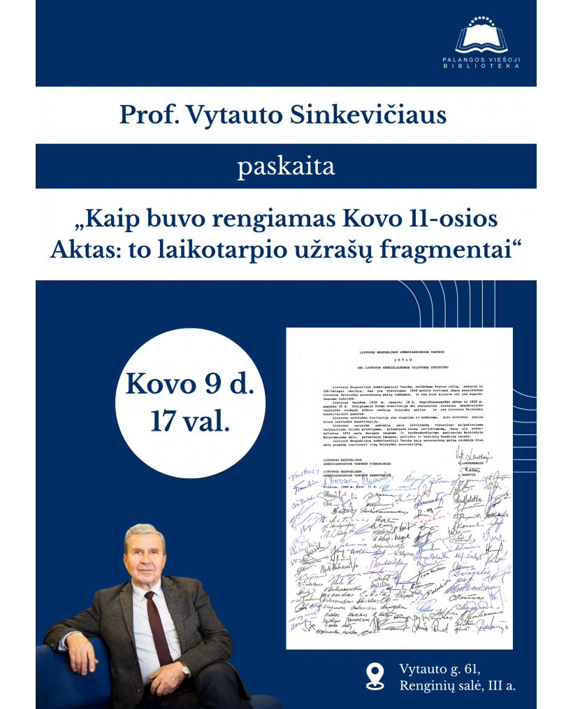 2026-03-09 Renginio data: 2026-03-09 17.00Kovo 9 d. 17 val. kviečiame į prof. Vytauto Sinkevičiaus paskaitą „Kaip buvo rengiamas Kovo 11-osios Aktas: to laikotarpio užrašų fragmentai“, kuri vyks Palangos viešosios bibliotekos renginių salėje (III a.).