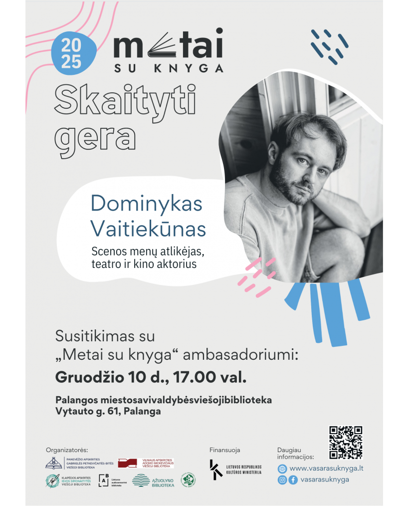 2025-12-10 Renginio data: 2025-12-10 17.00Gruodžio 10 d., trečiadienį, 17 val. Palangos viešojoje bibliotekoje vyks susitikimas su skaitymo skatinimo iniciatyvos „Metai su knyga“ ambasadoriumi, scenos menų atlikėju, aktoriumi Dominyku Vaitiekūnu.